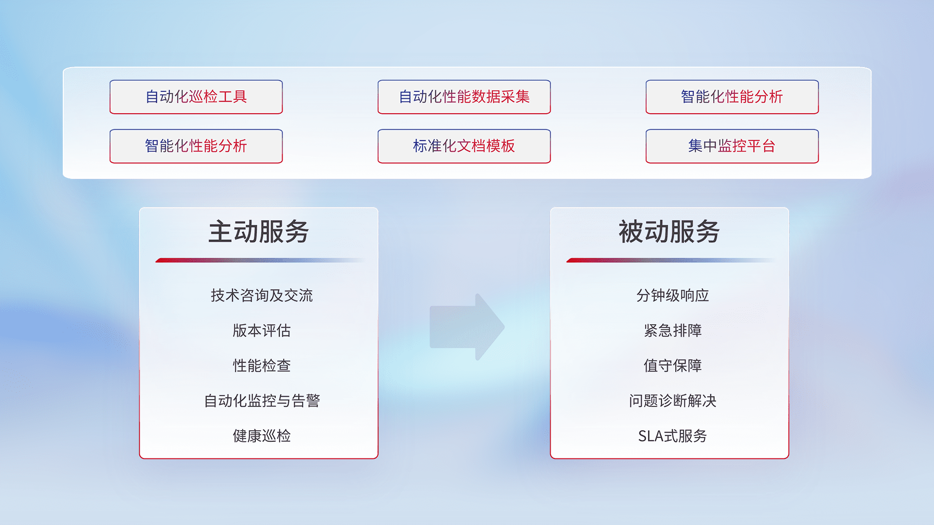 智能化工具和标准化文档,,,,保障服务质量,,,提供主动服务(包含技术咨询、、、版本评估、、、、性能检查、、、、自动化监控与告警、、、、健康巡检)和被动服务包含(分钟级响应、、、、紧急排障、、值守保障、、、问题诊断解决、、、SLA服务)。。。
