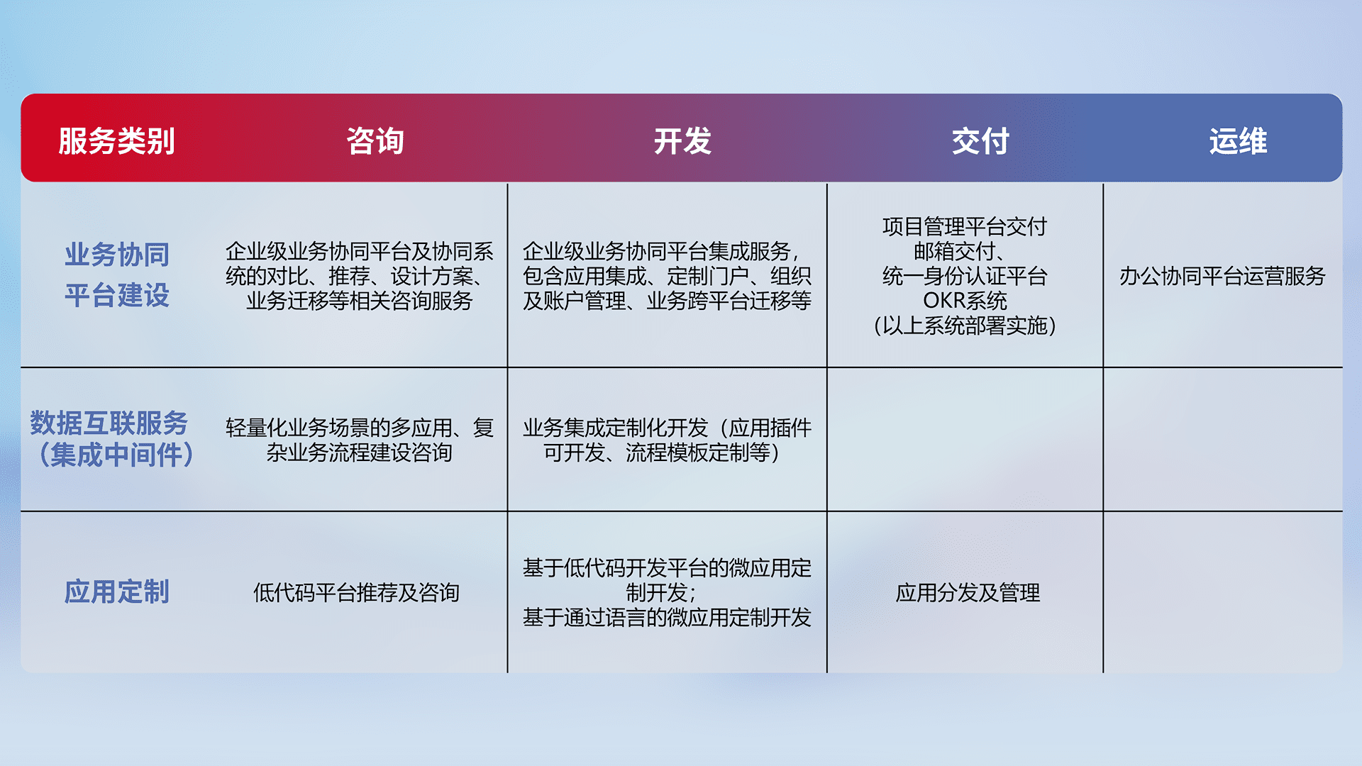 针对钉钉、、、企微、、、、IDaas等平台级产品提供产品的规划、、、、方案、、、交付、、、、定制化开发等服务,,,实现如统一协同办公、、、、智能客户服务、、、、混合会议管理、、智能数据查询、、等业务场景,,,实现数字化转型。。。